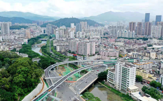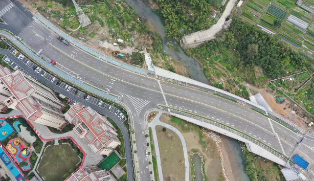 羅橋節(jié)點改造提升工程2019年11月開工建設,2021年8月建成通車。該項目沿北環(huán)西路、龍興路設置南北分離式雙向四車道高架,南側接龍興路,北側接現(xiàn)狀北環(huán)西路,高架靠東側布置(緊貼烈士陵園),橋梁總長約1140米,凈寬約7.7米;在雙洋路、龍川北路、北環(huán)西路設置人行天橋,與山體步道銜接,以完善慢行系統(tǒng);在烈士陵園山體下采用明挖回填方式設置框涵,長度約225米,凈寬10.75米。工程投資1.4億元。