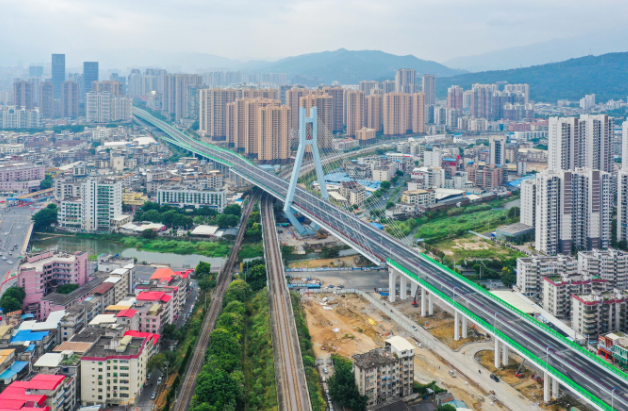 龍巖大道高架橋2013年9月開工建設,2020年10月建成通車。該項目地面道路長3395米,寬78米;高架橋部分長2329米,標準段寬26米,含一座(190+150)米的獨塔雙索面斜拉橋,斜拉橋寬34.2米;葫蘆溪分洪工程長667米,標準段結構7.5×3.9米,總投資24億元。